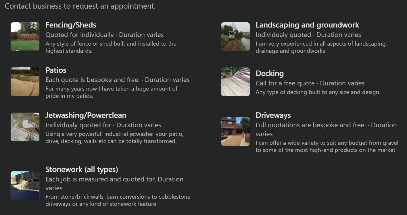 * Woodwork and Structures: Decking, fencing, gates, pergolas, garden structures, and sleeper installations.